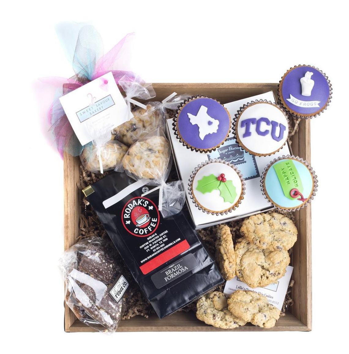 Just in time for holiday shopping and hostess gifting, TCU Florist has expanded its services to offer gift baskets filled with wine and local culinary treats, such as cupcakes, scones, locally roasted coffee, cheeses, fudge and more.