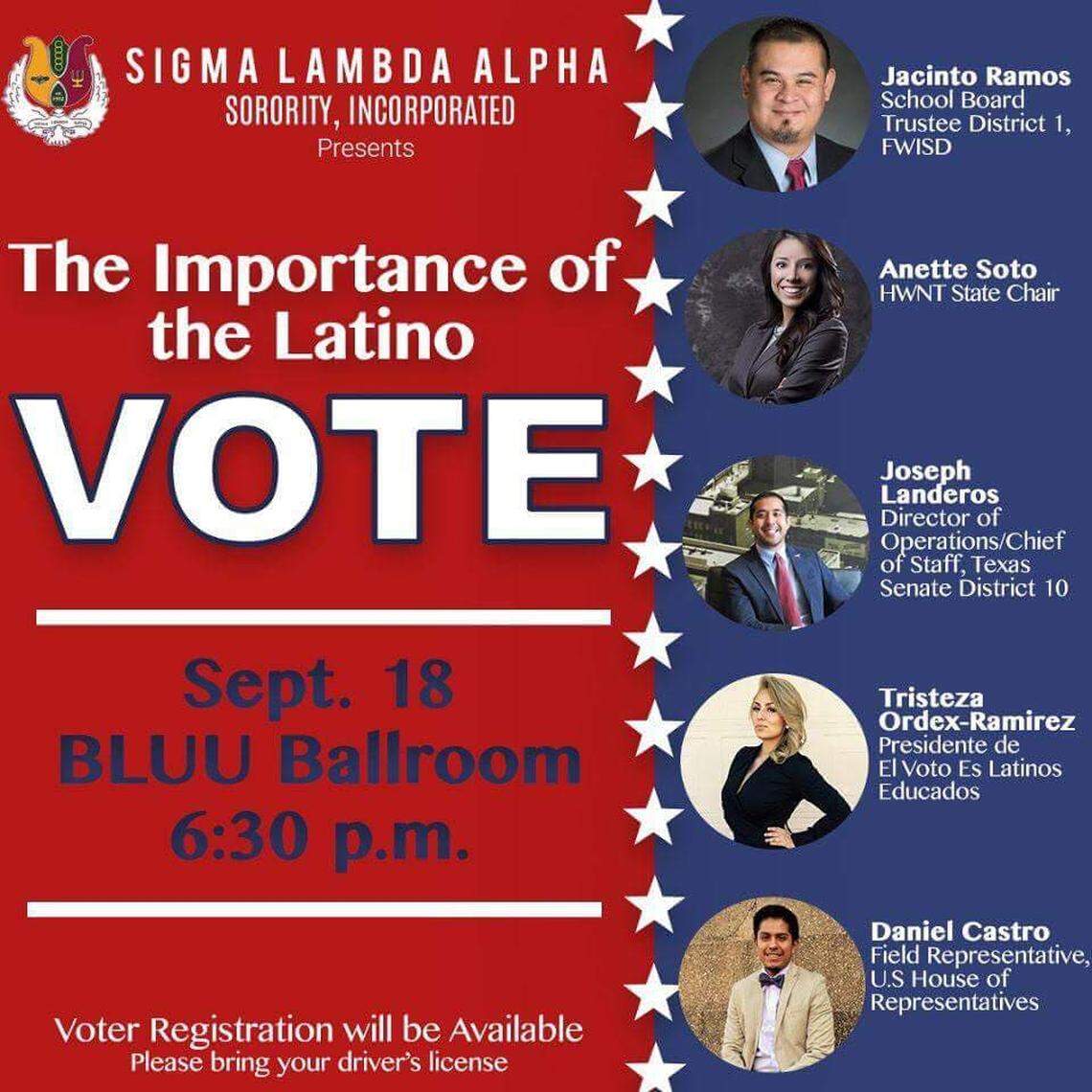 To learn about the local impact of the Latino vote, on September 18, the Sigma Lambda Alpha Sorority at TCU will host a panel featuring FWISD School Board Trustee Jacinto Ramos, Hispanic Women’s Network of Texas State Chair Anette Soto and others.