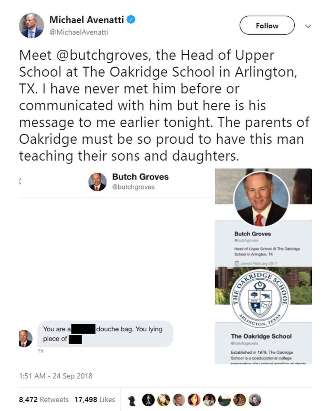 Butch Groves, who is listed online as Oakridge’s Head of Upper School, called Avenatti a “f------ douche bag” and a “lying piece of s---” in a direct message on Twitter before dawn on Monday. Avenatti represents porn actress Stormy Daniels and recently said he had a client who can back sexual assault claims against U.S. Supreme Court Brett Kavanaugh.