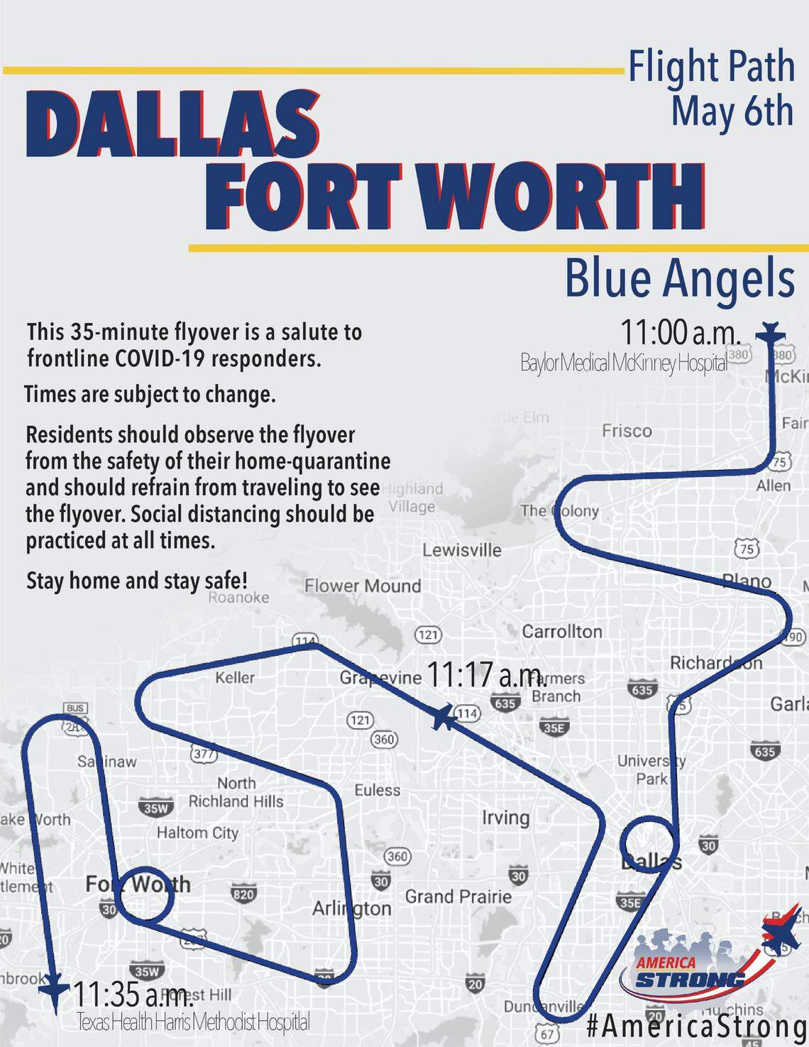 The Navy’s Blue Angels have released the flight path of Wednesday’s 35-minute flyover to honor COVID-19 first responders. The flyover begins at 11 a.m. in McKinney. The planes will circle downtown Dallas and Fort Worth.