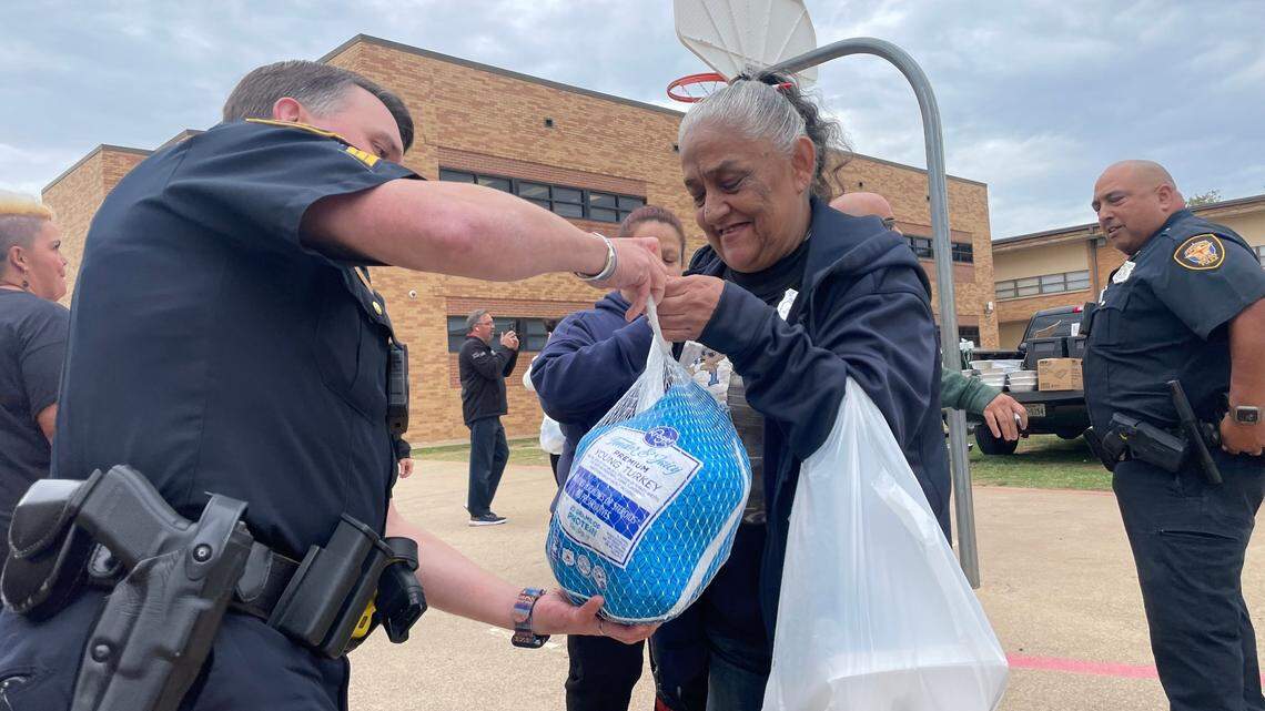 More than 170 families lined up outside Carter Park Elementary School in Fort Worth on Monday to get turkeys to take home for Thanksgiving, handed out by nonprofit Fort Worth Metro and Fort Worth police.