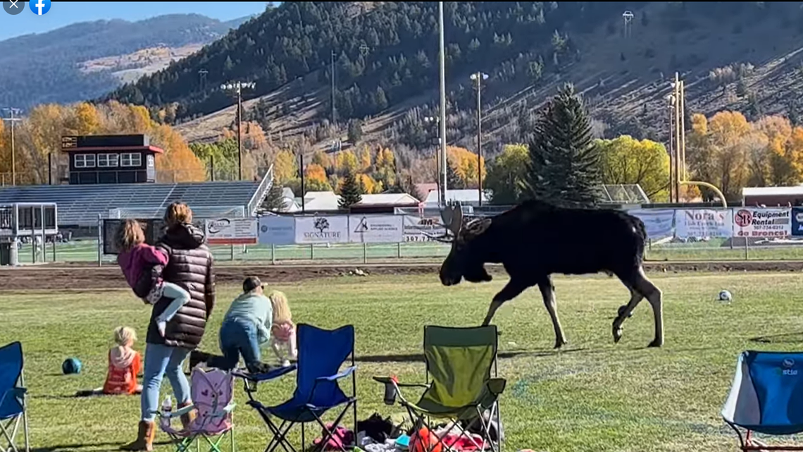 Players and parents scrambled out of the way as a moose trotted onto the field during a youth soccer game in Wyoming over the weekend.