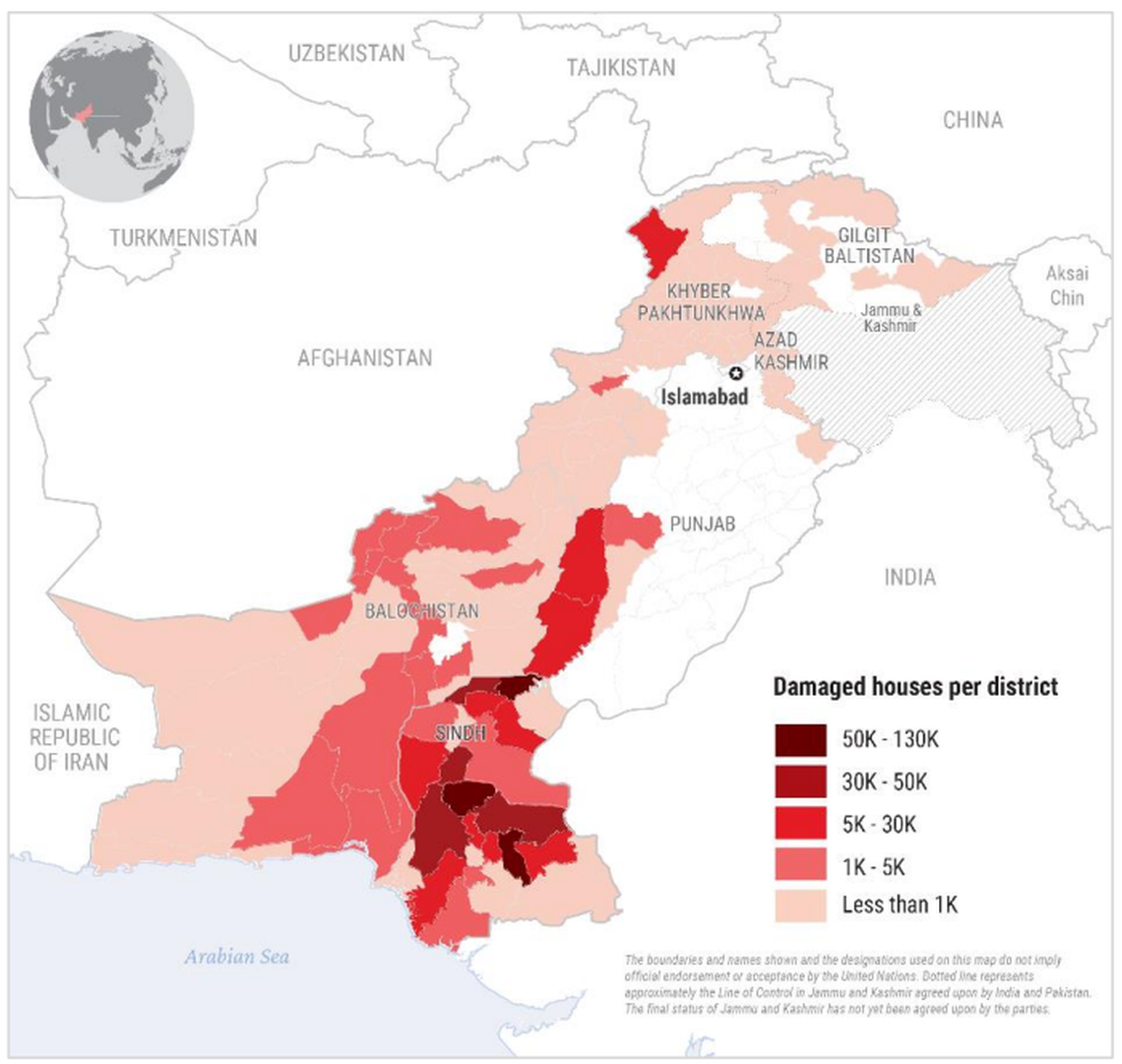 A map of the monsoon floods from the United Nations Office for the Coordination of Humanitarian Affairs on Aug. 26 showed damage across the country with the worst damage in the southern provinces of Balochistan and Sindh.