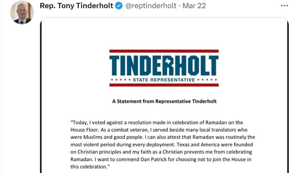 “We want to thank Rep. Tinderholt for his willingness to meet with CAIR and his Muslim constituents to discuss his statement about Ramadan,” White said. “Despite our differences, Texans can celebrate and learn from each other. It is refreshing and welcomed that Representative Tinderholt took the time to listen, learn, and issue an apology.”