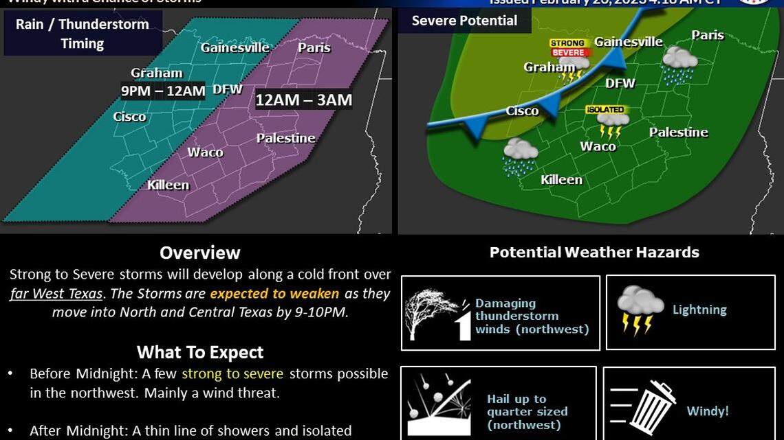 According to the weather service, storms should reach Fort Worth sometime between 9 p.m. and midnight. The highest potential for severe weather will be generally limited to areas west of Interstate 35 and north of Interstate 20.
