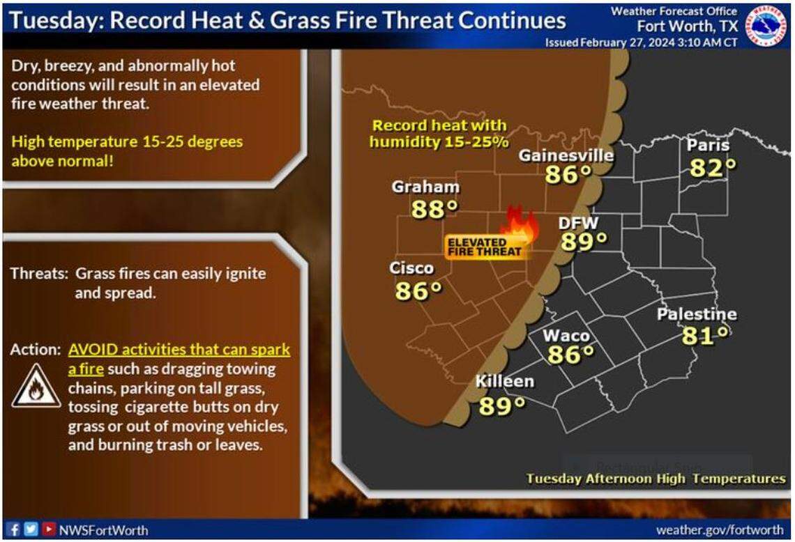 “Elevated fire weather concerns will exist along and west of the I-35 corridor this afternoon,” the National Weather Service Fort Worth report states.