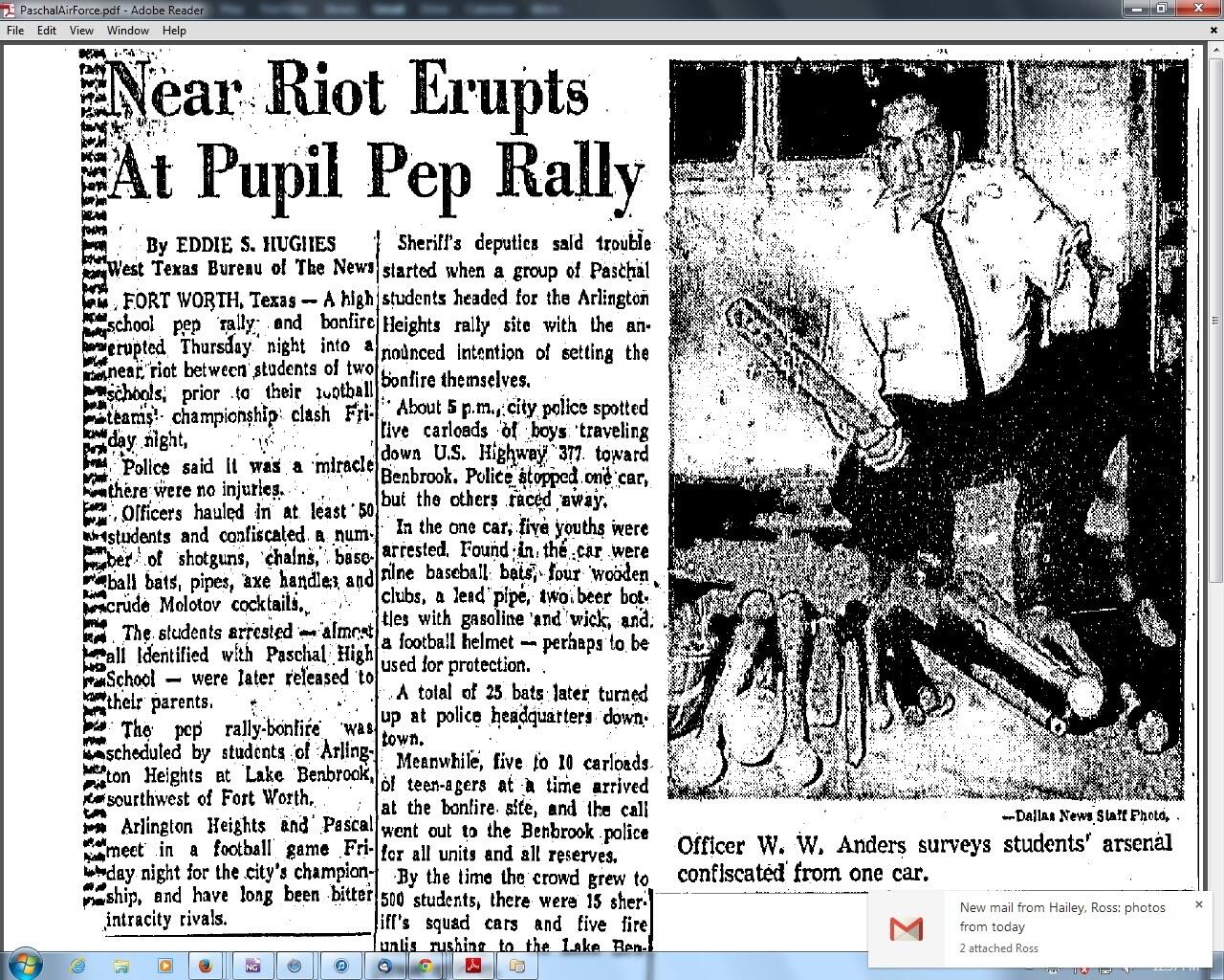 That would be the Great Bonfire Incident of 1963, when police arrested 46 Paschal High School boys and alumni after a Hollywood-worthy land-and-air assault on an Arlington Heights High School spirit rally at Benbrook Lake.