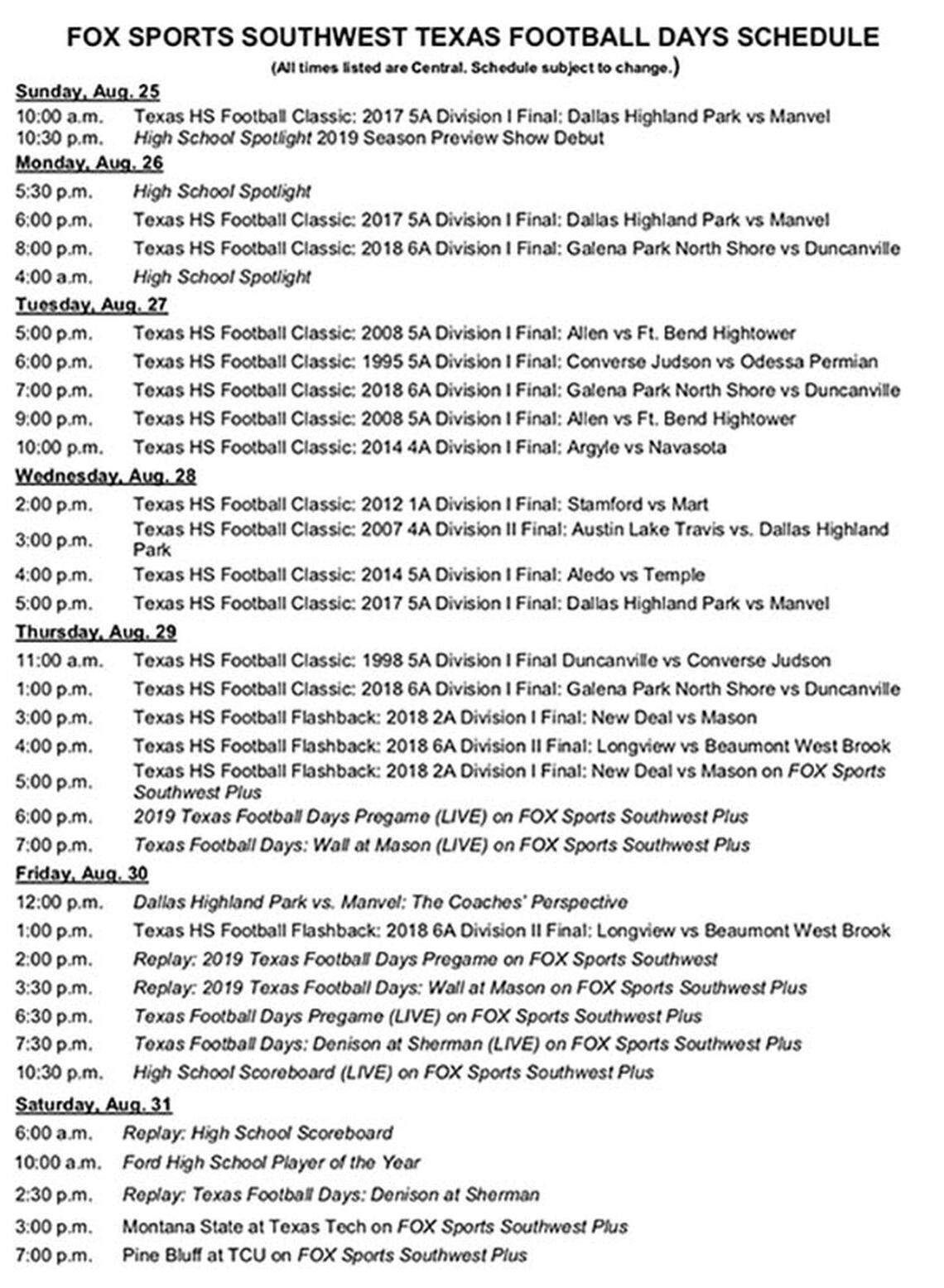Texas Football Days will begin on Aug. 25 at 10:00 a.m. with the replay of the 2017 Class 5A Division I title game between Highland Park and Manvel with the High School Spotlight season preview show debut at 10:30 p.m.