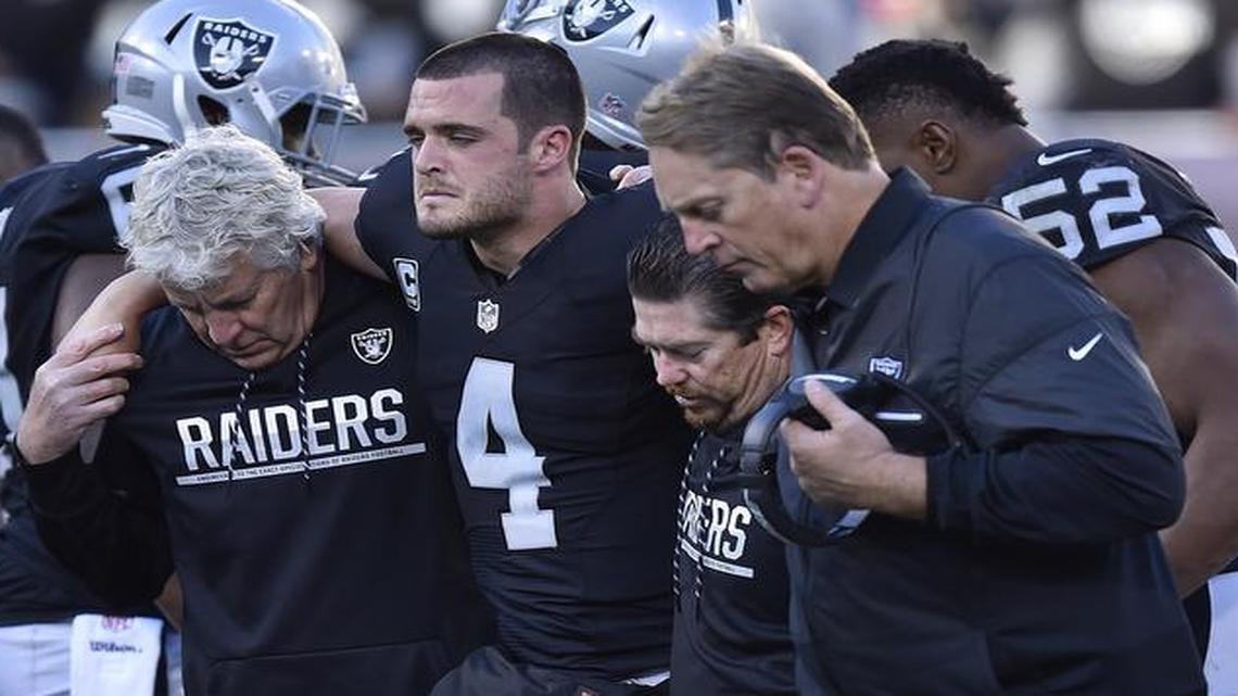 The Oakland Raiders can clinch the AFC West title and a first-round bye if Kansas City loses on Sunday night. But the Raiders’ hopes in the postseason took a huge blow when quarterback Derek Carr suffered a broken right leg.